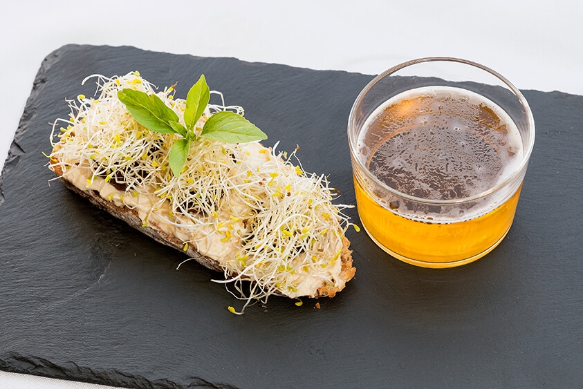 Torrada de pa de llavors amb quinoa, humus, tomàquet sec al sol i brots d'alfals acompanyada de degustació de cervesa artesana.