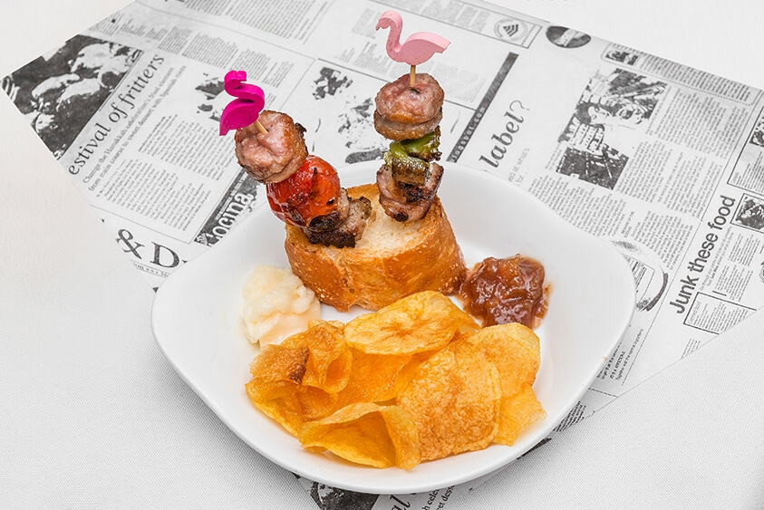 Dues broquetes amb botifarres variades (ceps, escalivada, alls tendres i all i julivert) amb salsa allioli i compota de figues.