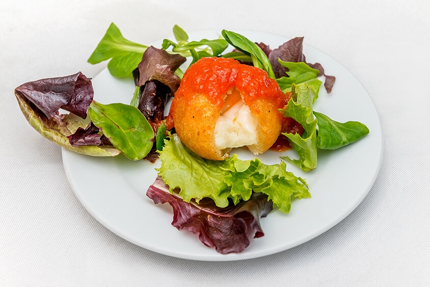 Bomba de iuca amb cor de formatge provolone acompanyat de salsa picant de gamba vermella.