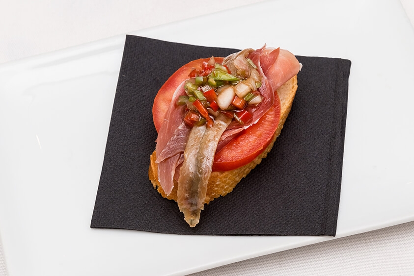 Pinxo de pa torrat amb tomàquet, pernil serrà, anxoves i salsa vinagreta.