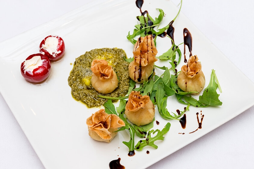 Farcellets de pasta filo farcits de brandada de bacallà ruixats amb crema de mòdena acompanyats amb pebrot "mini-piquillo" amb formatge de cabra caramel·litzada amb mel.